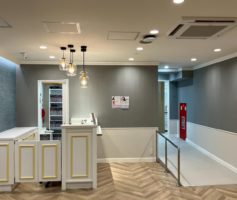池袋駅前に新規出店するデンタルクリニックの内装工事を行いました。施工前は脱毛サロンの居抜き物件で残すものと造るものを選定し内装イメージを新しく変えることができました。